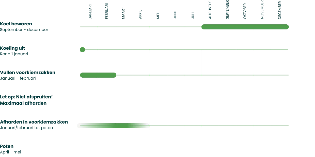 Als het pootgoed erg koud is en het is al laat in de tijd, dan is het zinvol de poters op te warmen. Dit is in de praktijk meestal 3-5 dagen een temperatuur van 18°-20°C. Stop als u de eerste witte puntjes ziet. Pas op voor zuurstofgebrek.