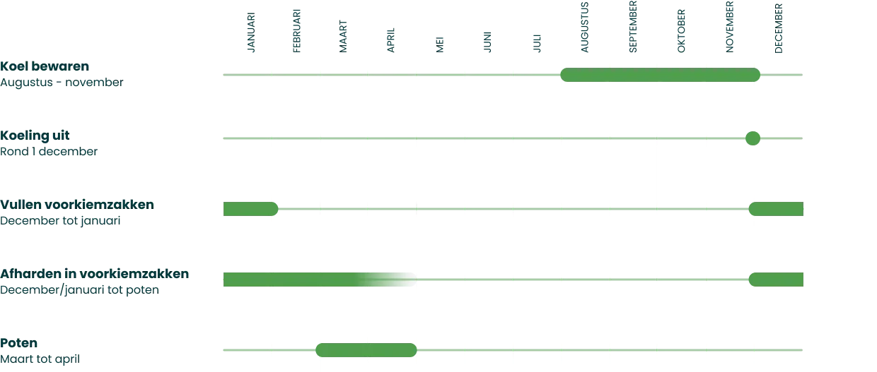 Grote partijen kunnen in januari – februari in de schuur staan. Deze kunnen binnen 2 of 3-hoog gestapeld worden. Wanneer er geen vorst is, de deuren en luiken zoveel mogelijk open zetten. Vanaf maart tot het poten buiten afharden. Ideaal.